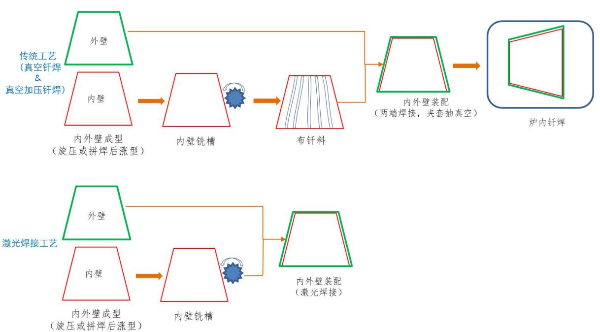 激光作為火箭發(fā)動機身部及噴管延伸段焊接方式有眾多優(yōu)勢。傳統(tǒng)的火箭發(fā)動機噴管延伸段分為:再生冷卻式、輻射冷卻式、排放冷卻式、燒蝕冷風式。真空釬焊是銑槽式再生冷卻噴管夾層的常規(guī)焊接方法,此方式焊縫強度一般,操作流程復雜,焊接需在真空環(huán)境中進行,焊接過程難以實現(xiàn)自動化,且對操作人員技術水平要求較高。國內具有生產(chǎn)液體火箭發(fā)動機噴管能力的設備均為航天科技集團旗下的7103廠、211廠所擁有,制造周期長,生產(chǎn)成本高。經(jīng)過分析與論證,激光焊接作為銑槽式再生冷卻噴管夾層結構焊接的首選,具有制造周期短,自動化程度高,環(huán)境要求低等眾多優(yōu)勢,可大大縮短火箭發(fā)動機噴管研制周期(可壓縮至10h),降低噴管的制造成本,從而有效降低火箭的發(fā)射成本。