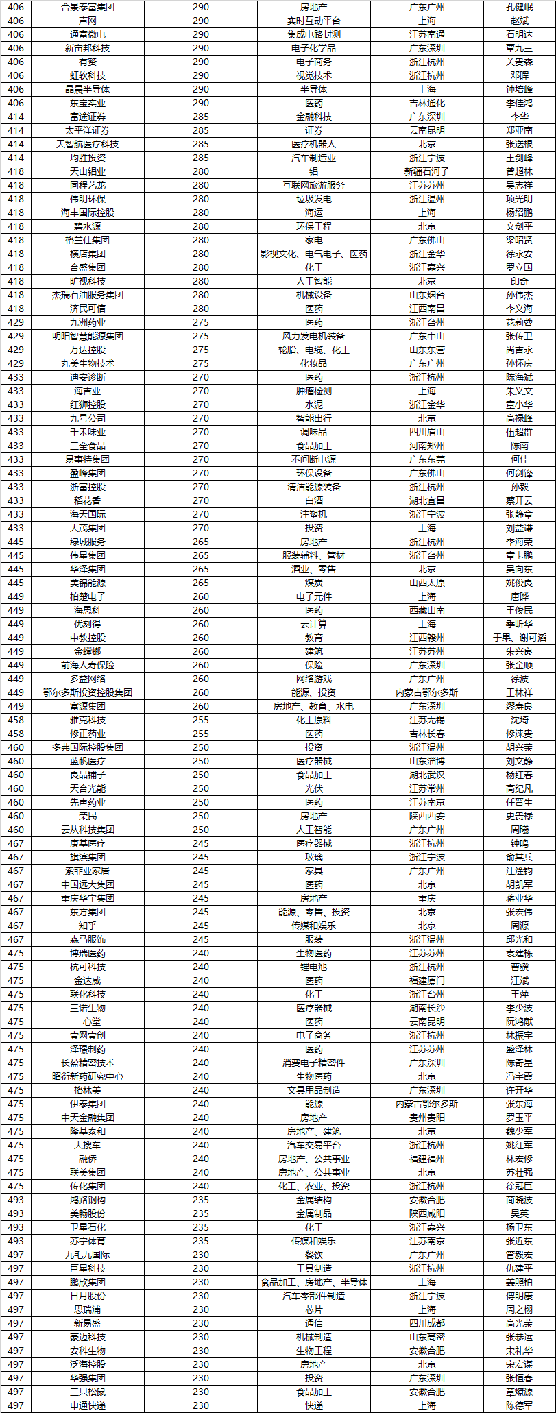 500強民營企業去年銷售額總和22萬億元,是去年中國GDP的五分之一,超過英國一年的GDP;共擁有員工970萬人。胡潤表示:“要上中國500強榜單并不容易,今年門檻比去年高了90億元,達到230億元,但仍然有120家企業新上榜,500強的平均價值比去年增長了55%,達到1100億元。上榜企業在各個領域已經達到世界級。”