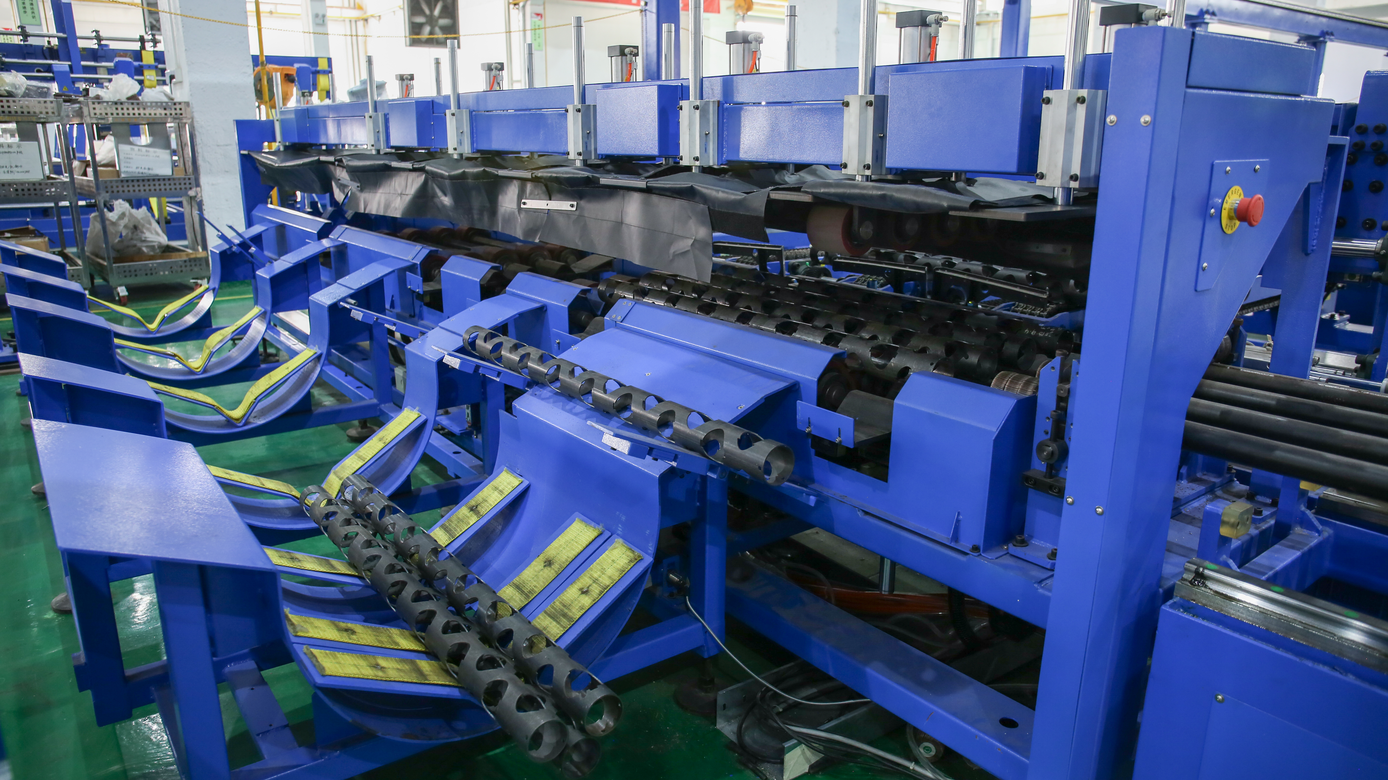 該產線由中央調度系統自動分配任務,三臺全自動激光切管機對指派的任務實現全自動上料、下料及激光加工;自動分揀系統對加工彈架進行自動分揀、計數,到達指定數量后,全自動搬運系統進行自動搬運至內壁處理系統;內壁自動處理系統對彈架進行自動分料、上料、內壁拋光、自動下料,完成拋光的彈架通過RGV傳輸線轉運至焊接、裝配車間進行焊接、裝配、打包,彈架成品經RGV傳輸線返回庫房;生產線配以封閉安全防護系統及聲光報警系統。
