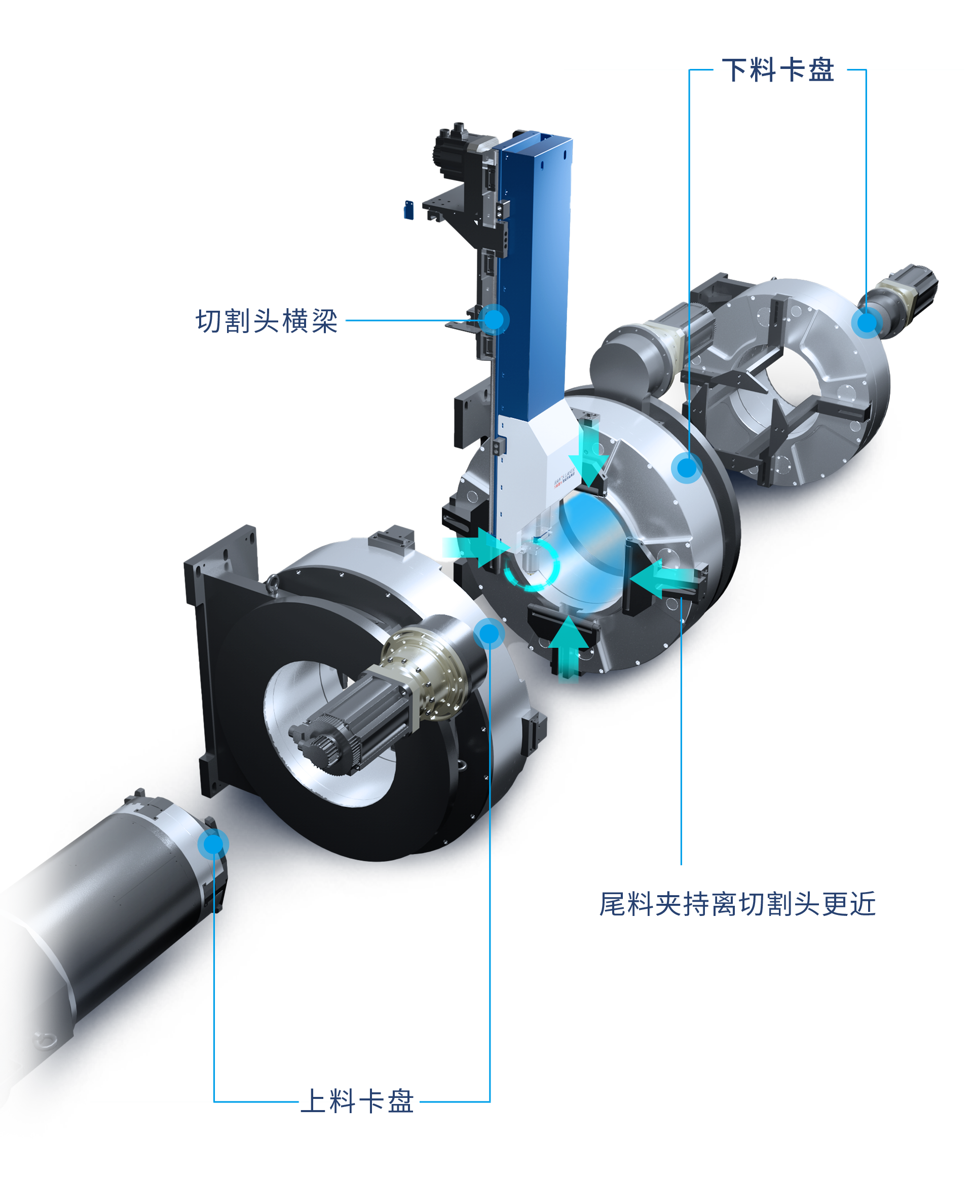 四卡盤同軸夾管,管材夾持端離切割頭更近,