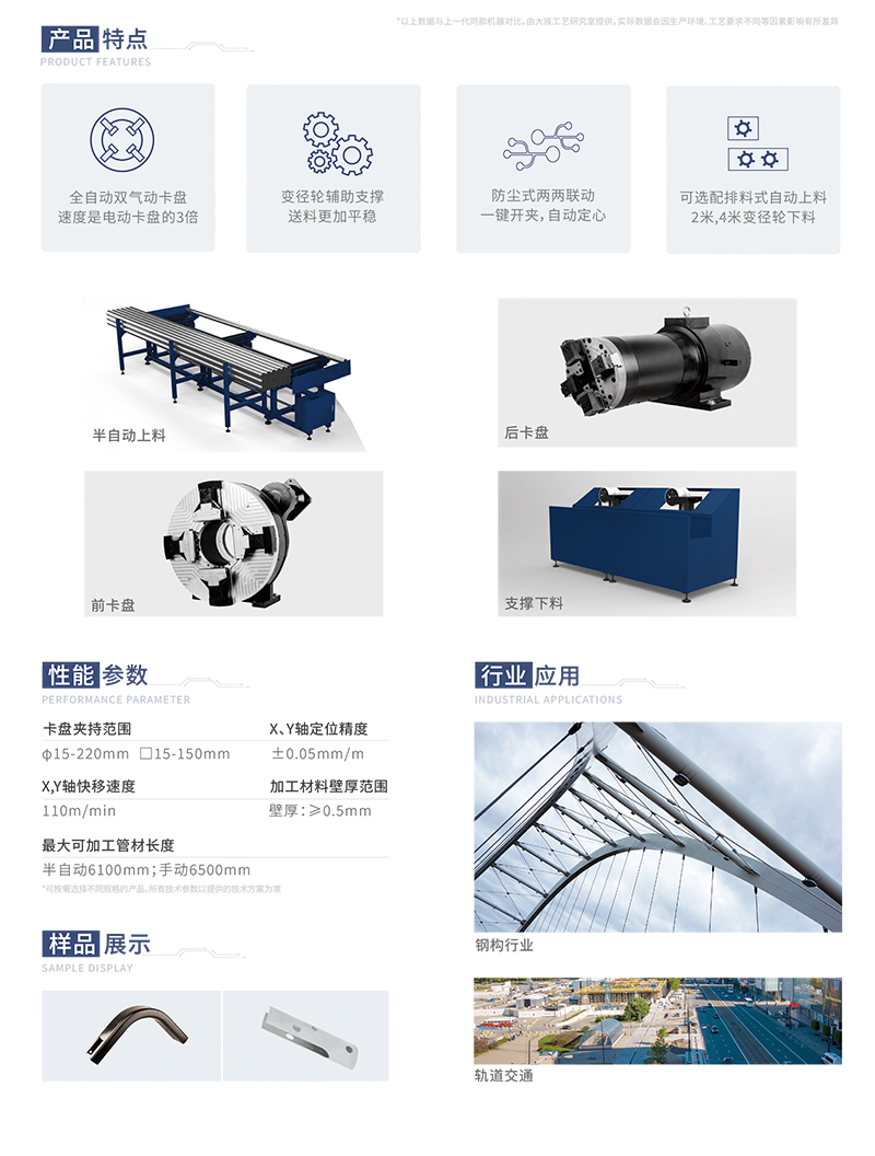 搭載全自動雙啟動卡盤,速度更快,配備變徑輪輔助支撐,送料更加平穩。可選配排料式自動上料、1組或2組變徑輪下料,生產更便捷。