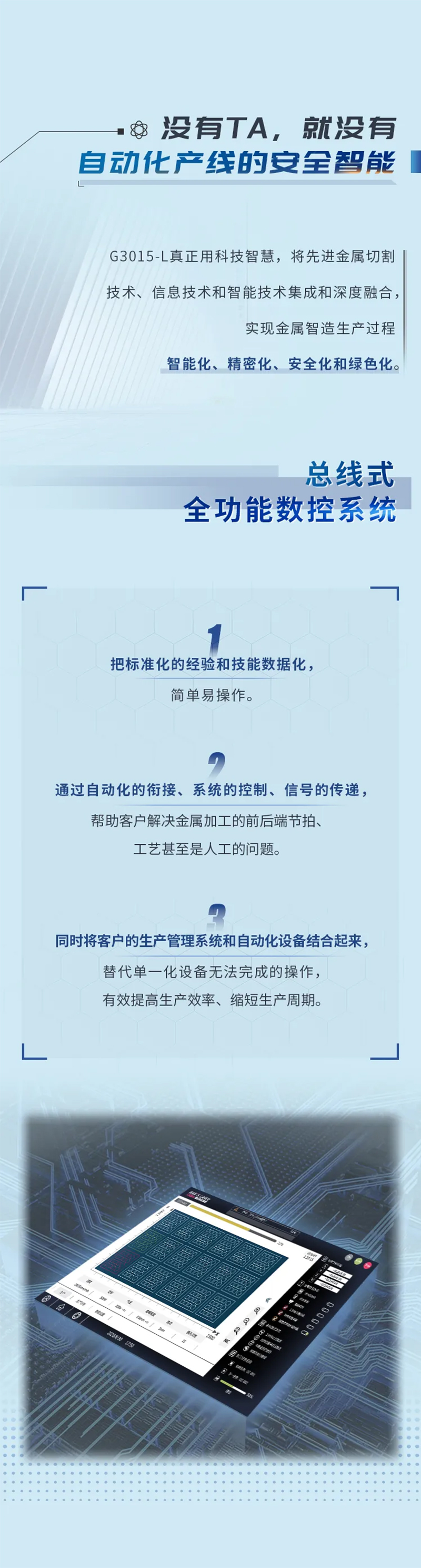 全新結構的ALU系列自動化切割生產線,協調性更高、效率更高,模塊化設計,可根據需求自由組合,預留擴展接口,可根據后續實際產能情況增加機器,實現1拖N,并可預留信息化接口,對接MES,為后續并入智能化數字車間做好基礎。